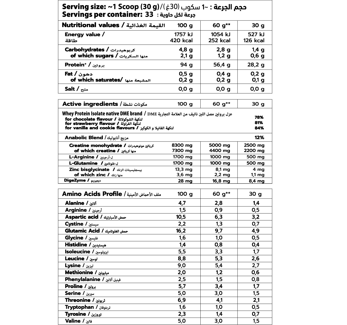 يتميز المنتج بنسبة بروتين مرتفعة ونقاء كبير بفضل عملية العزل المتقدمة، مما يجعله خيارًا مثاليًا للرياضيين و لاعبي كمال الأجسام الباحثين عن نتائج سريعة ومضمونة سواء في التضخيم النظيف أو التنشيف.
